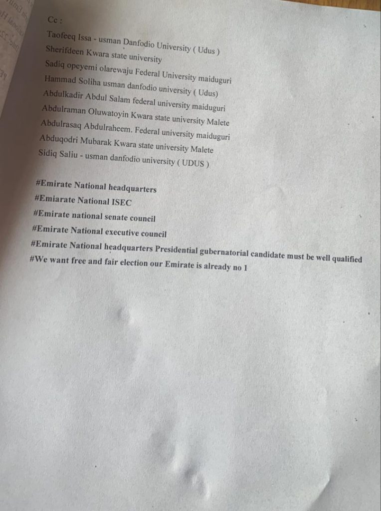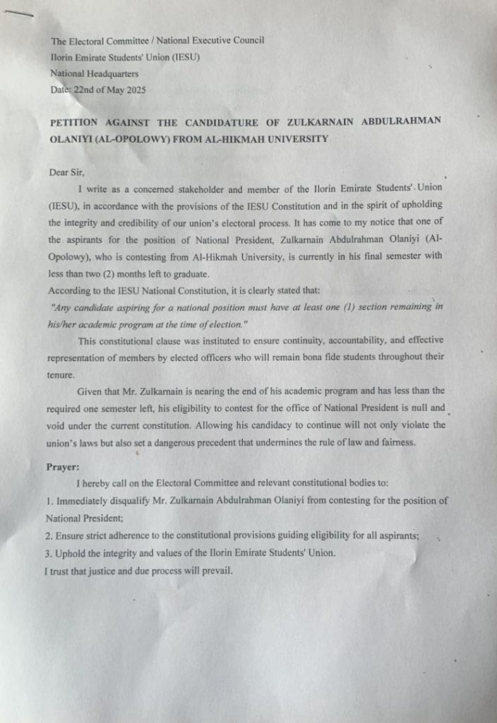 I write as a concerned stakeholder and member of the Ilorin Emirate Students’ Union (IESU), in accordance with the provisions of the IESU Constitution and in the spirit of upholding the integrity and credibility of our union’s electoral process.